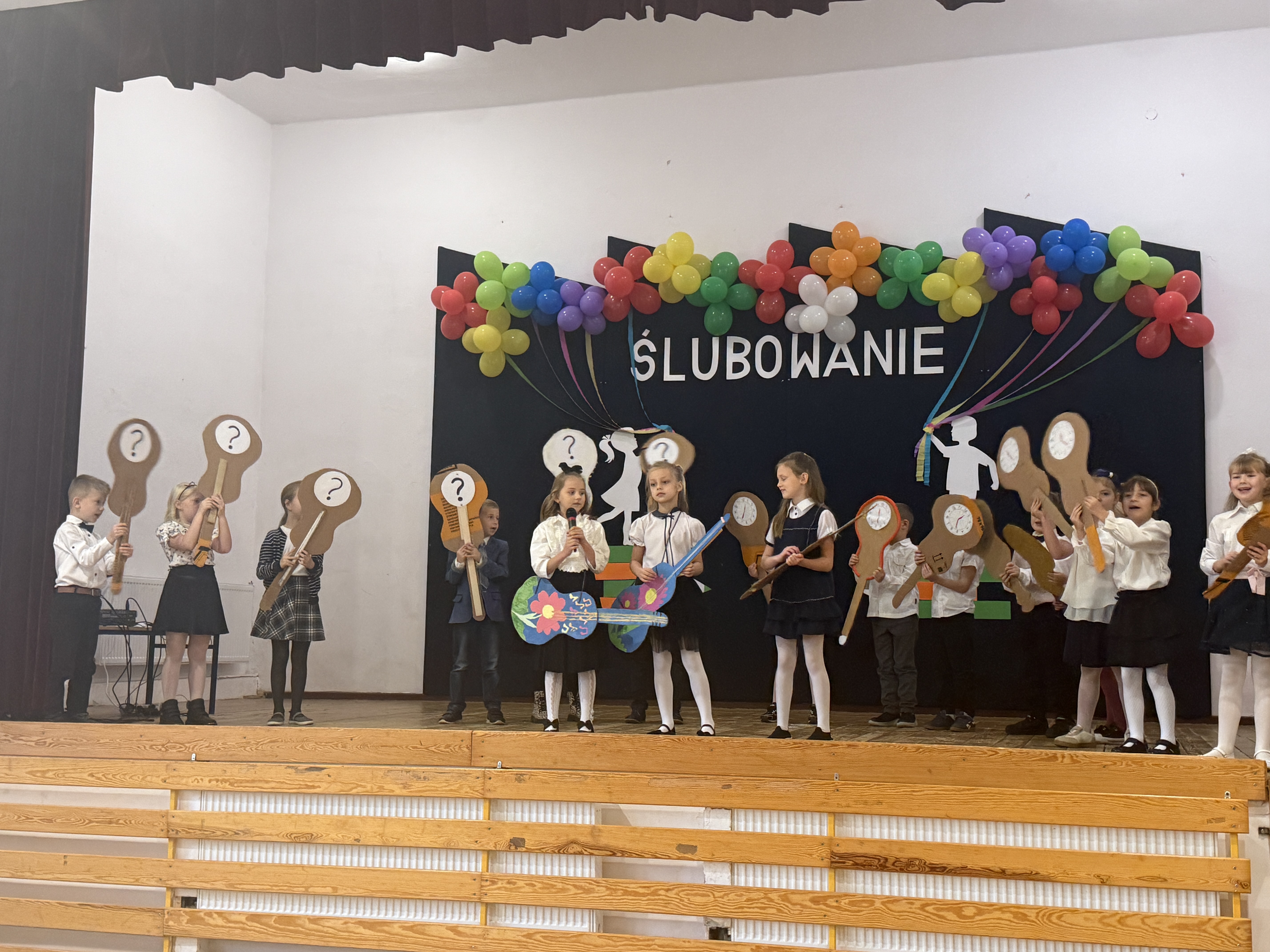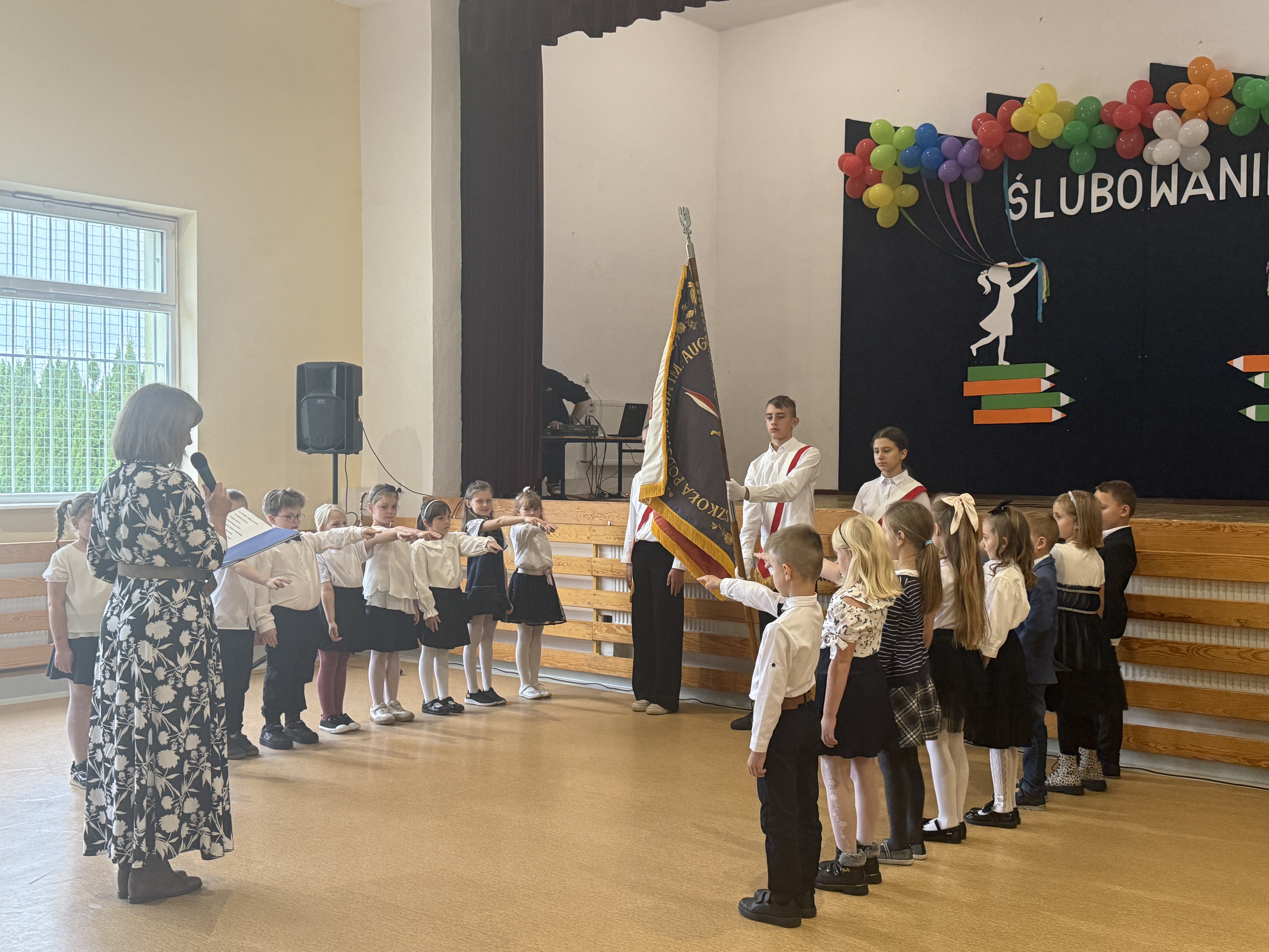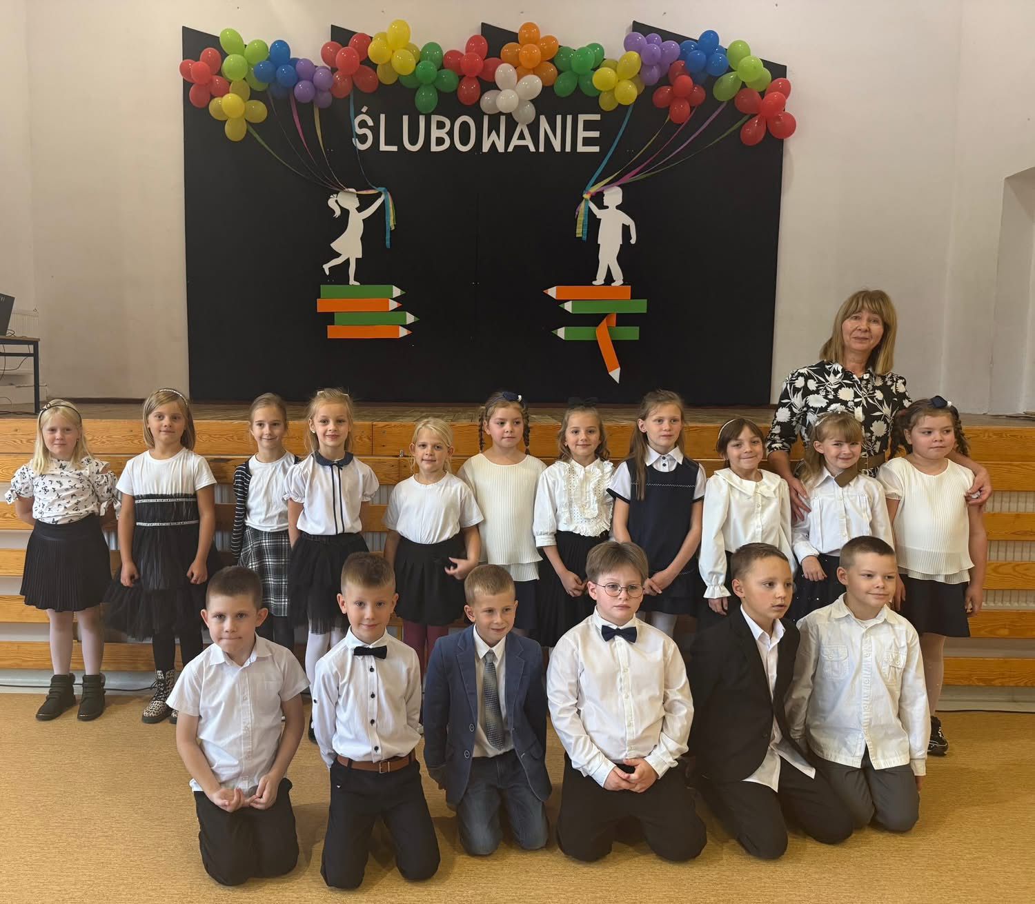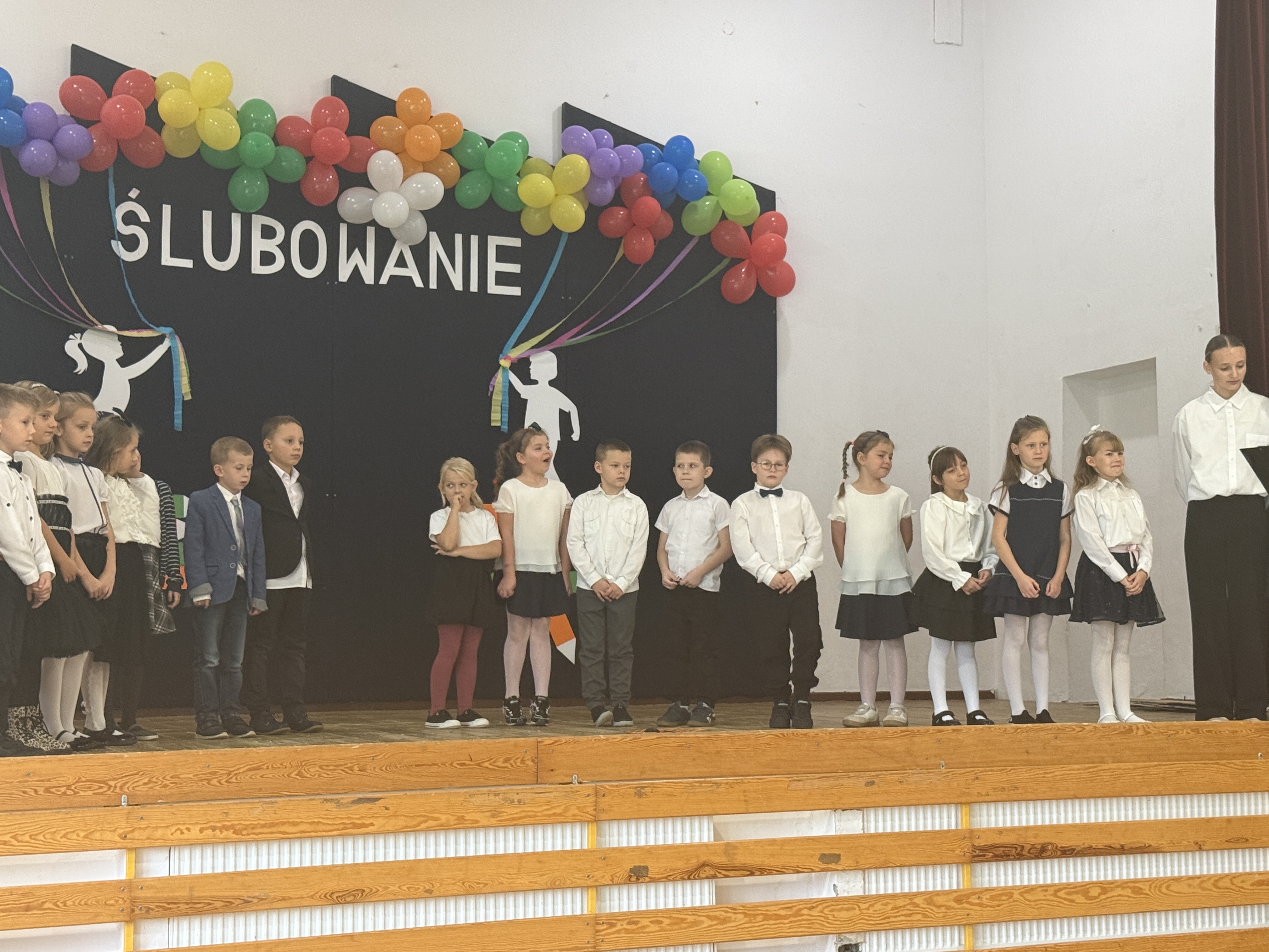 17 października 2025 roku, odbyła się ważna uroczystość - Pasowanie na Ucznia. Dzieci z klasy 1 przygotowywały się do tej uroczystości, uczyły się wierszy i piosenek. Tego dnia panowała świąteczna atmosfera. Dzieci zaprezentowały wzorowo przed Rodzicami, nauczycielami i starszymi kolegami swoje umiejętności. Publiczność nagrodziła dzielnych pierwszaków gromkimi brawami. Najważniejszym momentem uroczystości było złożenie przez Dzieci ślubowania na sztandar szkoły oraz pasowanie na ucznia, którego dokonała dyrektor szkoły. Ukoronowaniem aktu pasowania było wręczenie dyplomów i prezentów.