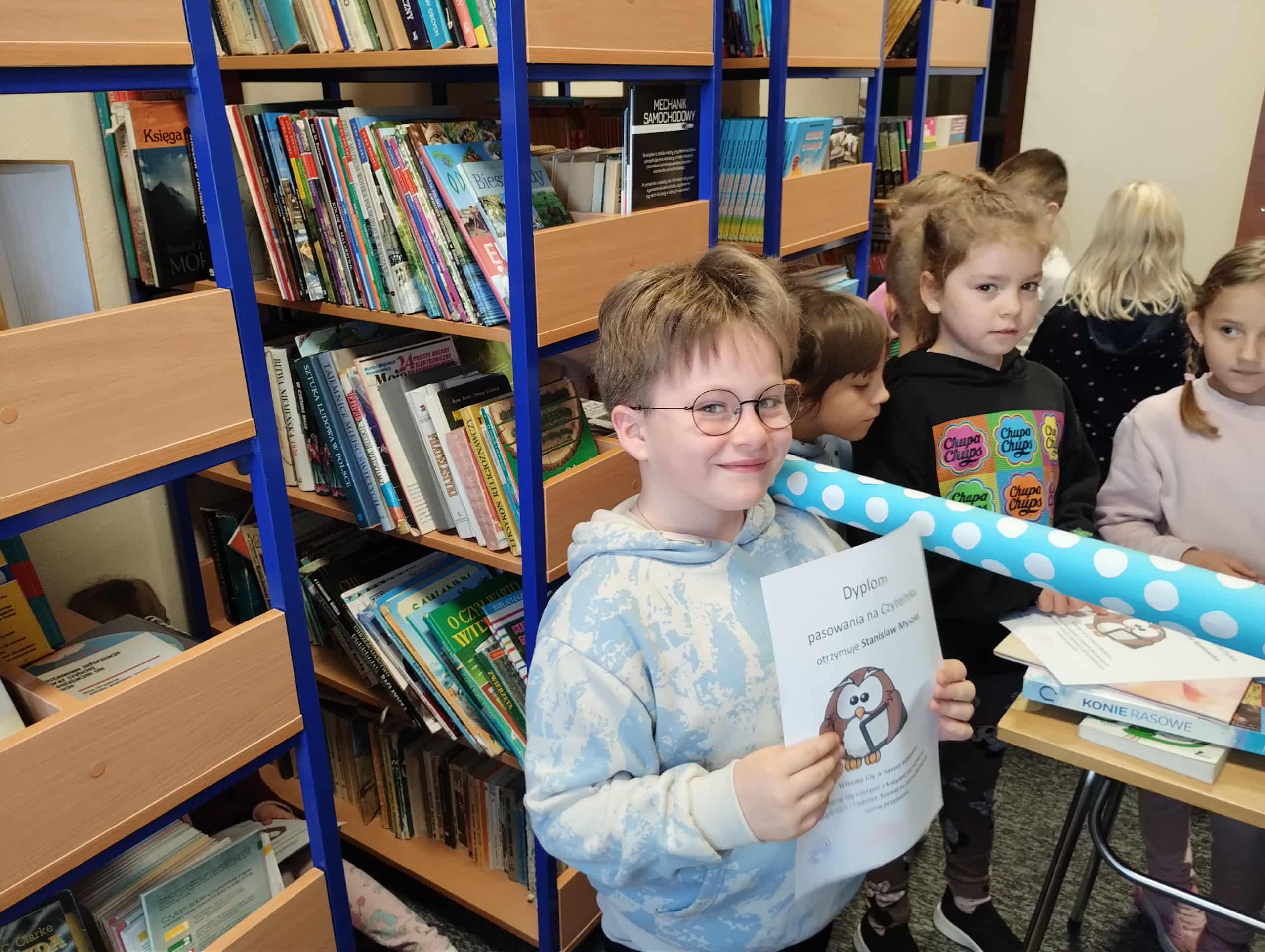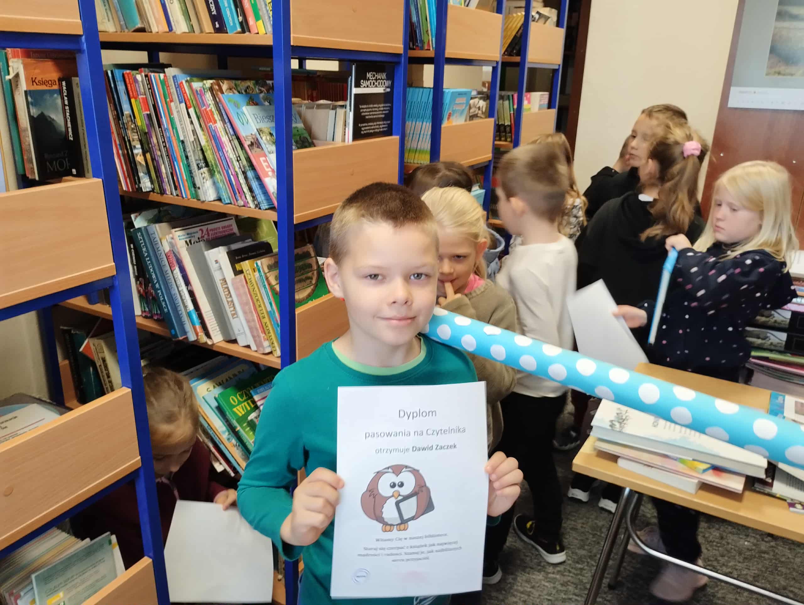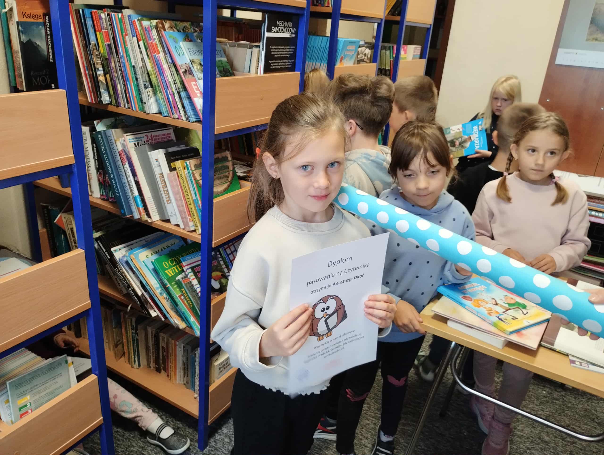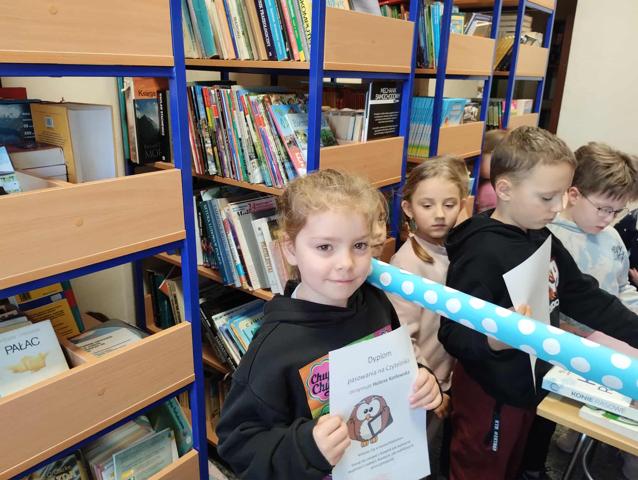 W szkolnej bibliotece, 21 października, odbyło pasowanie uczniów klasy 1 na czytelników. Pierwszoklasiści zapoznali się z zasadami wypożyczalnia książek, z tym jak należy obchodzić się z książeczkami w domu, co należy zrobić jak się zniszczą oraz zostali zaproszeni do czytania i oglądania zbiorów biblioteki podczas przerw. Wszyscy pięknie opowiadali o ulubionych książeczkach, dobrze wiedzieli co można robić, a czego nie można z wypożyczoną książką. Po pasowaniu poczęstowali się słodkościami i z dyplomem oraz książką w ręku wrócili na lekcje. Dziękuję za miłe spędzony czas z Wami. Anna Kaleta