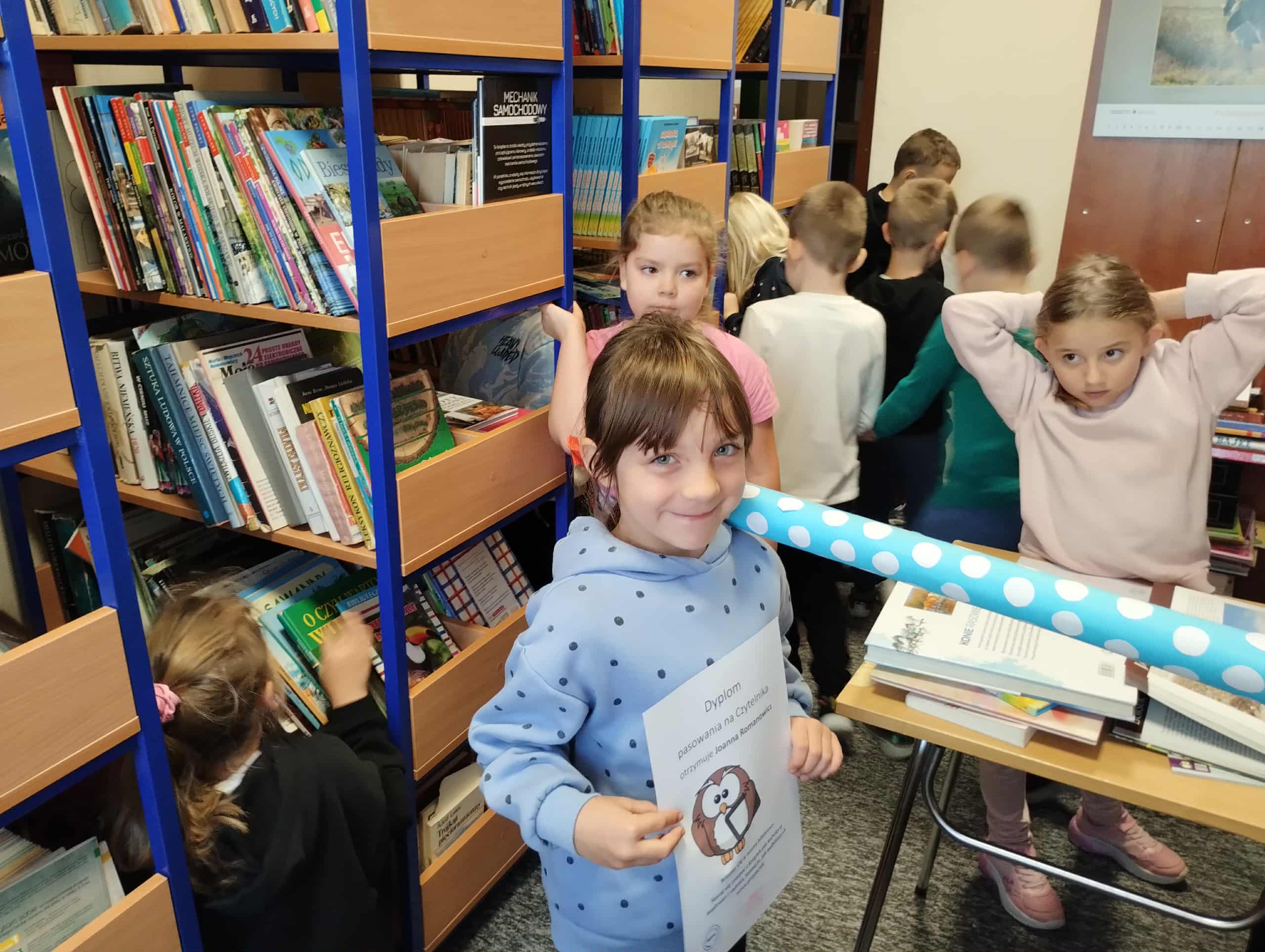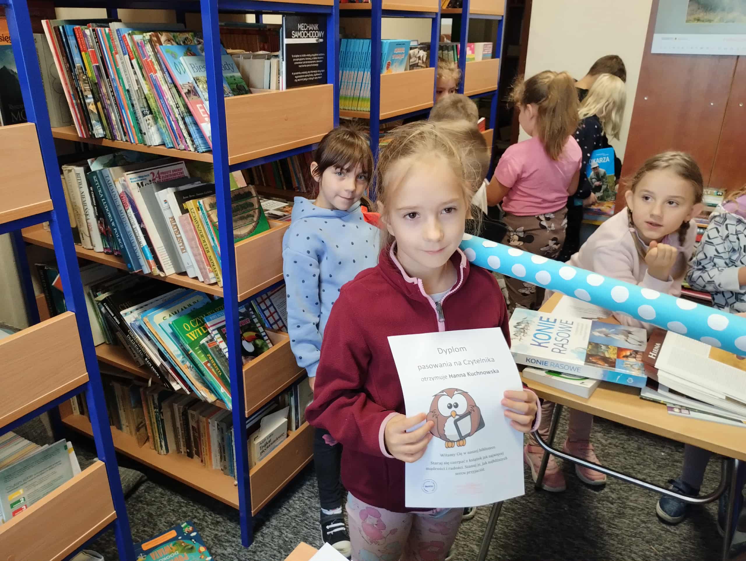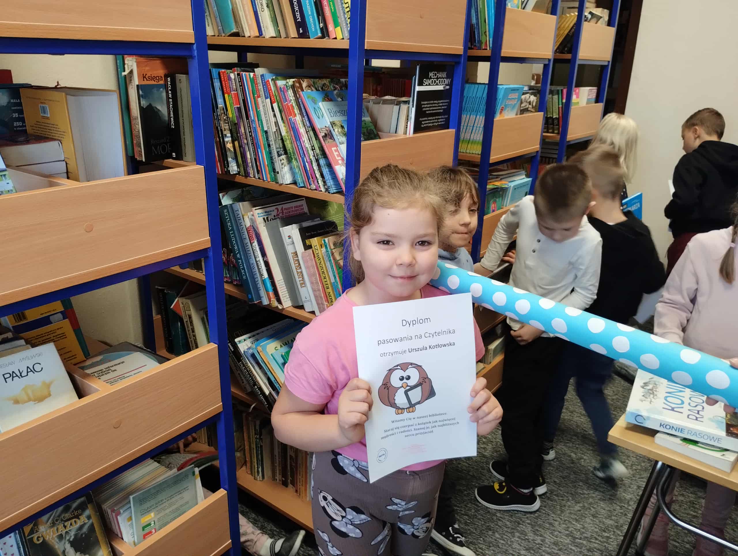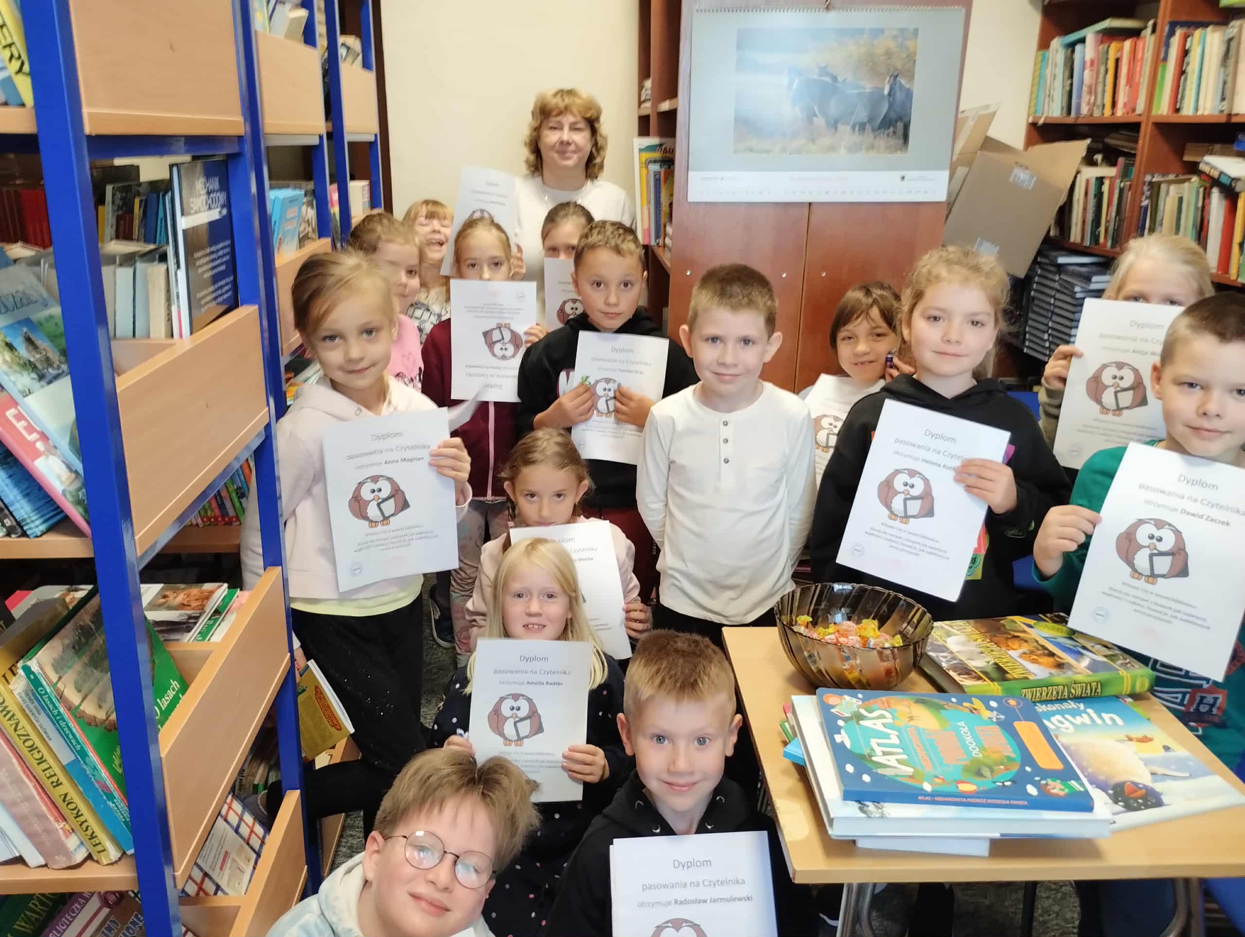 W szkolnej bibliotece, 21 października, odbyło pasowanie uczniów klasy 1 na czytelników. Pierwszoklasiści zapoznali się z zasadami wypożyczalnia książek, z tym jak należy obchodzić się z książeczkami w domu, co należy zrobić jak się zniszczą oraz zostali zaproszeni do czytania i oglądania zbiorów biblioteki podczas przerw. Wszyscy pięknie opowiadali o ulubionych książeczkach, dobrze wiedzieli co można robić, a czego nie można z wypożyczoną książką. Po pasowaniu poczęstowali się słodkościami i z dyplomem oraz książką w ręku wrócili na lekcje. Dziękuję za miłe spędzony czas z Wami. Anna Kaleta
