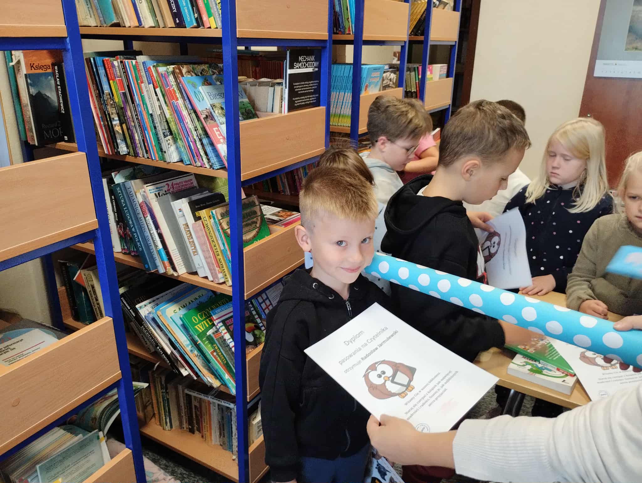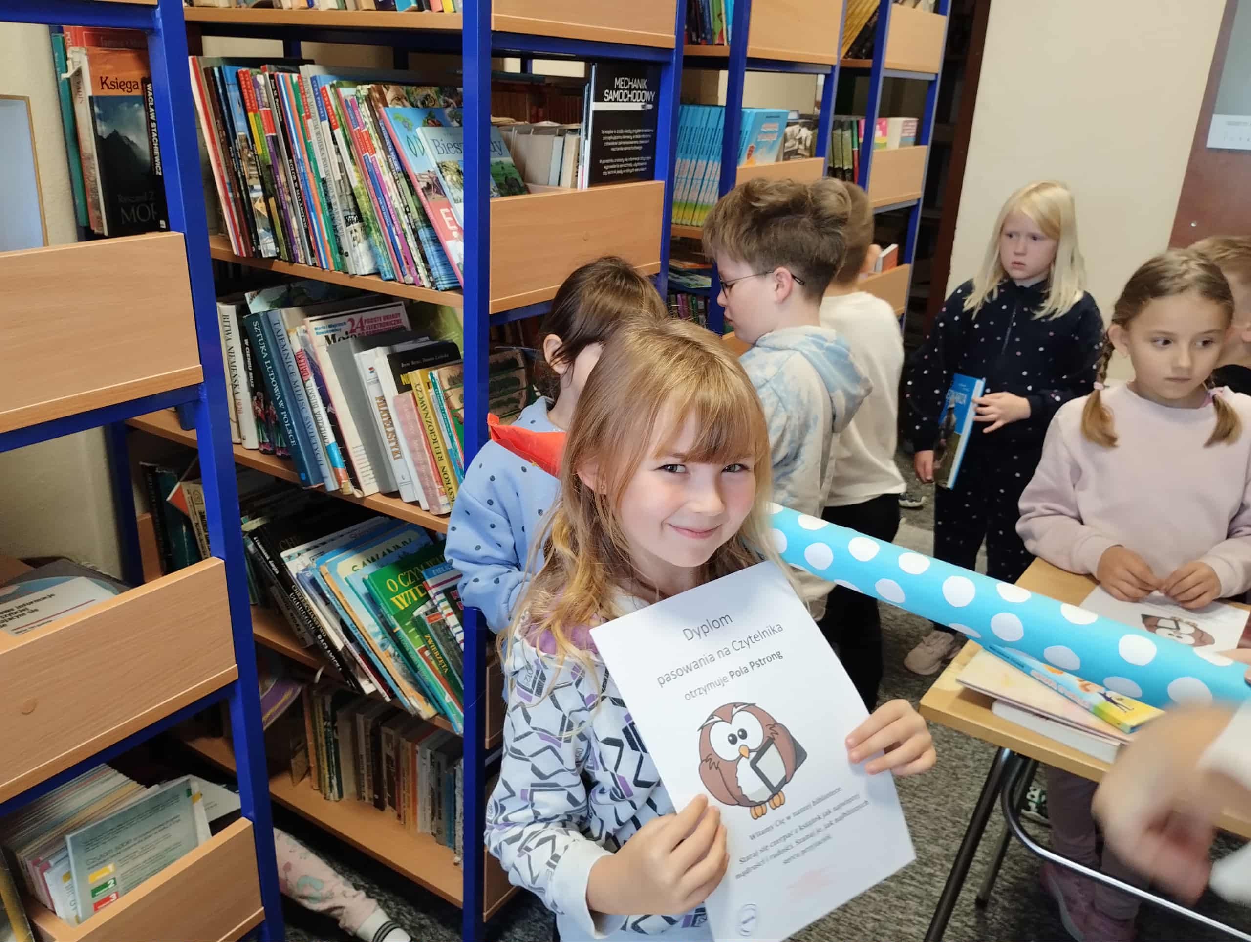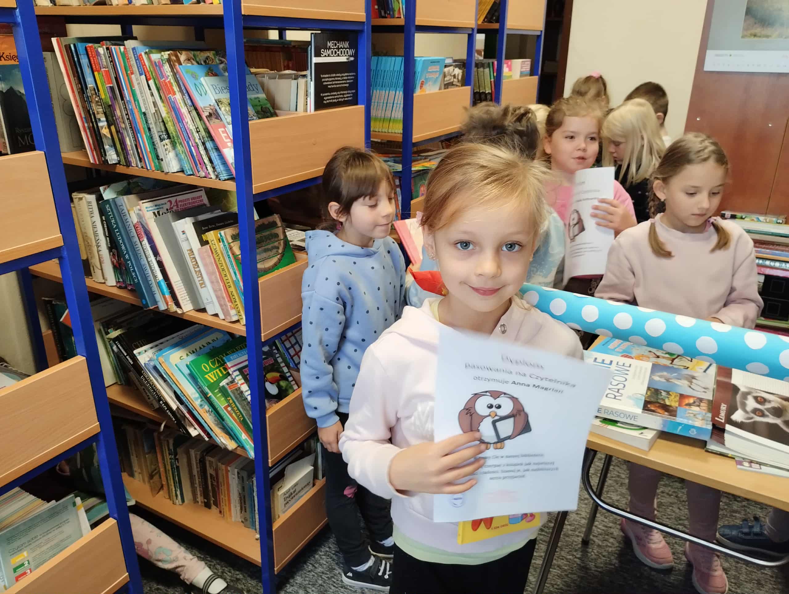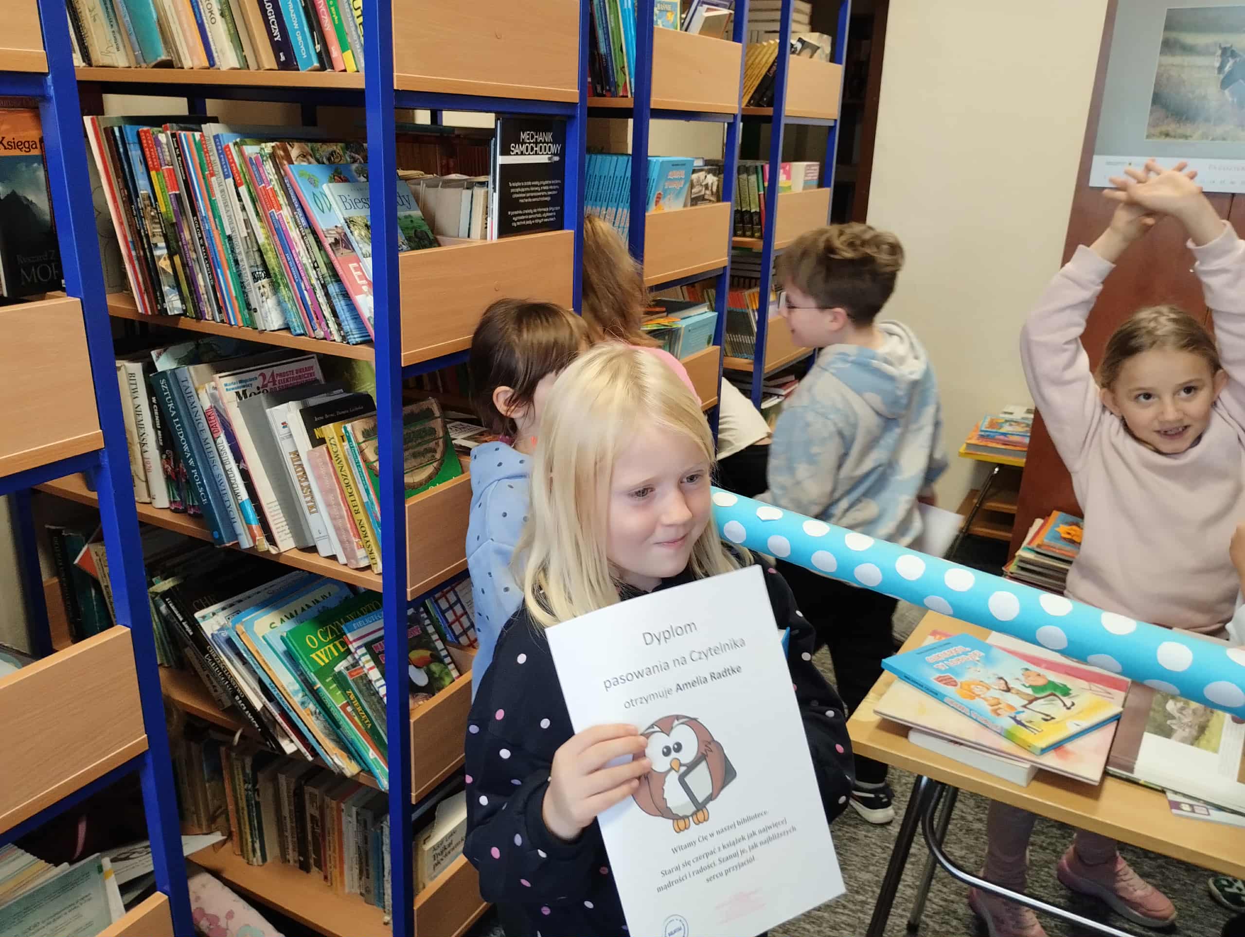 W szkolnej bibliotece, 21 października, odbyło pasowanie uczniów klasy 1 na czytelników. Pierwszoklasiści zapoznali się z zasadami wypożyczalnia książek, z tym jak należy obchodzić się z książeczkami w domu, co należy zrobić jak się zniszczą oraz zostali zaproszeni do czytania i oglądania zbiorów biblioteki podczas przerw. Wszyscy pięknie opowiadali o ulubionych książeczkach, dobrze wiedzieli co można robić, a czego nie można z wypożyczoną książką. Po pasowaniu poczęstowali się słodkościami i z dyplomem oraz książką w ręku wrócili na lekcje. Dziękuję za miłe spędzony czas z Wami. Anna Kaleta