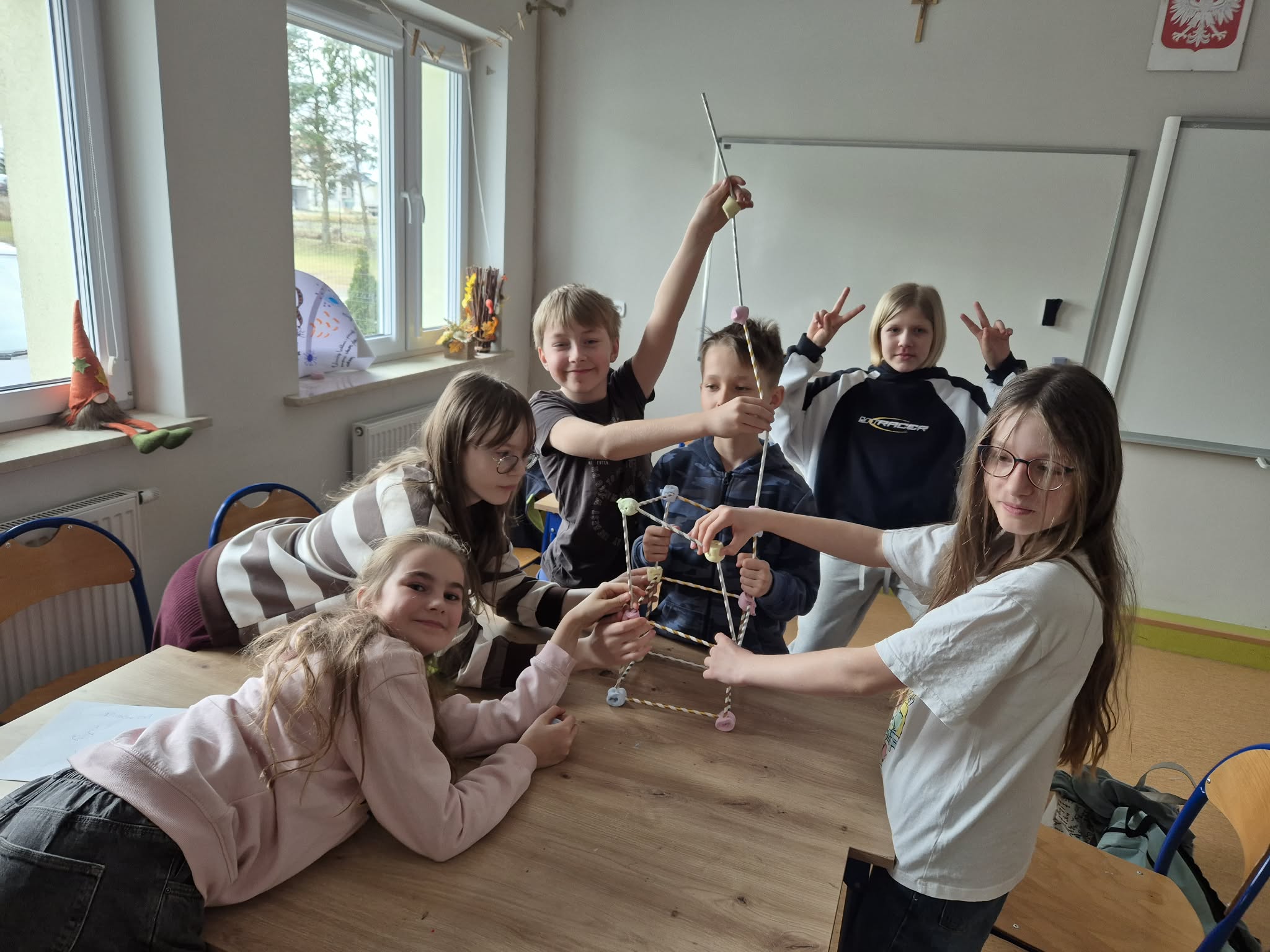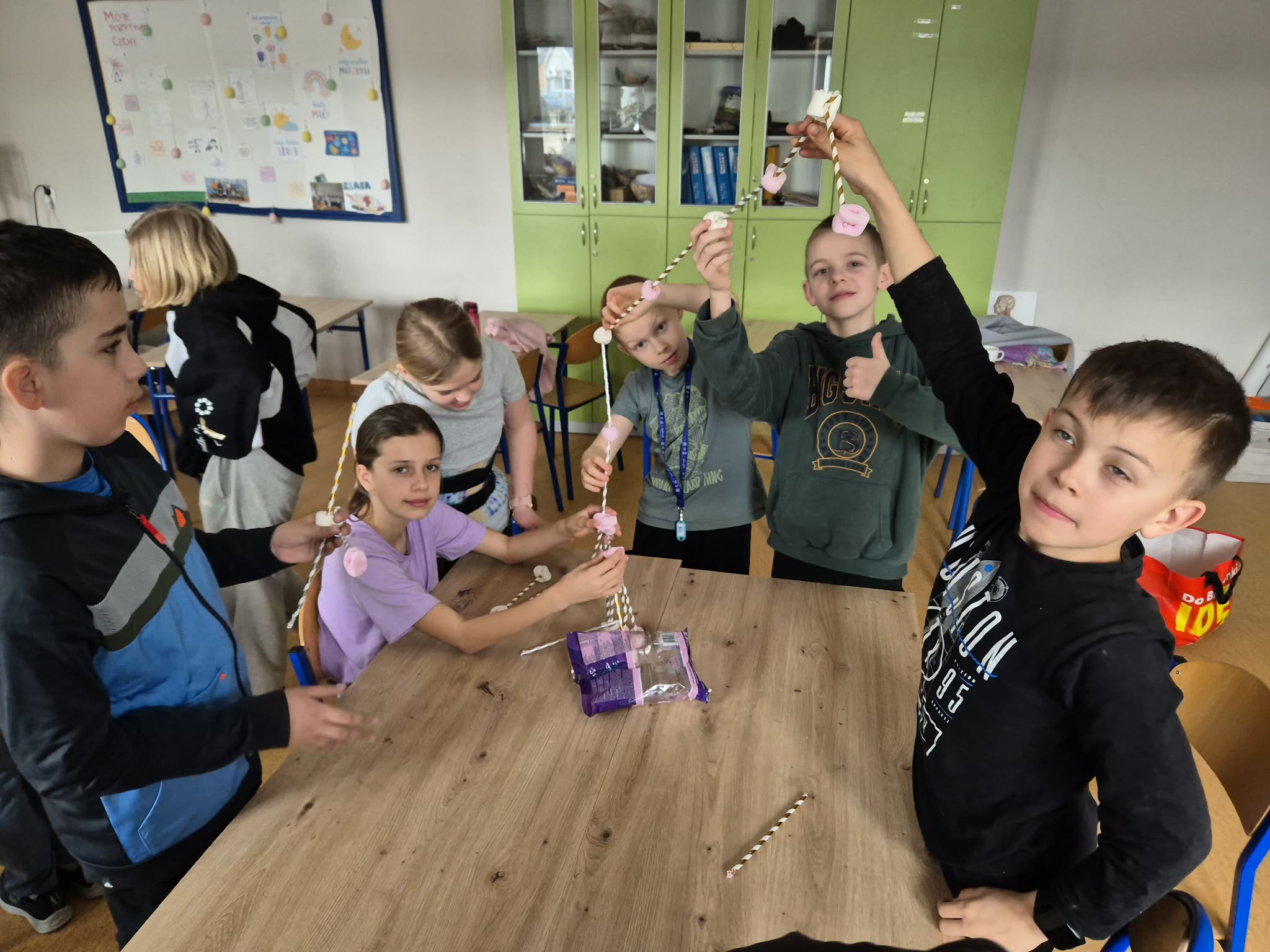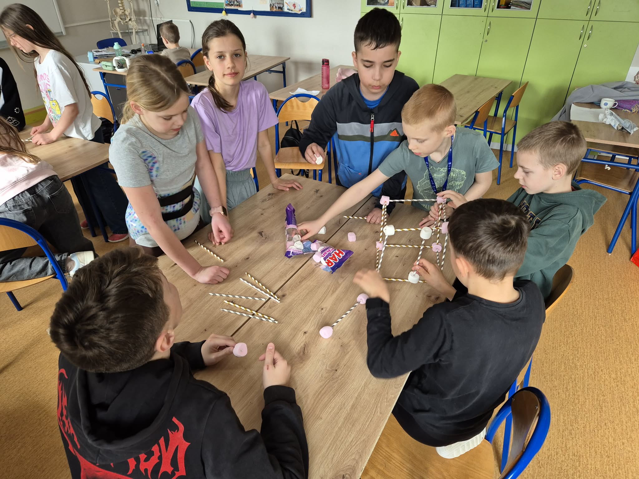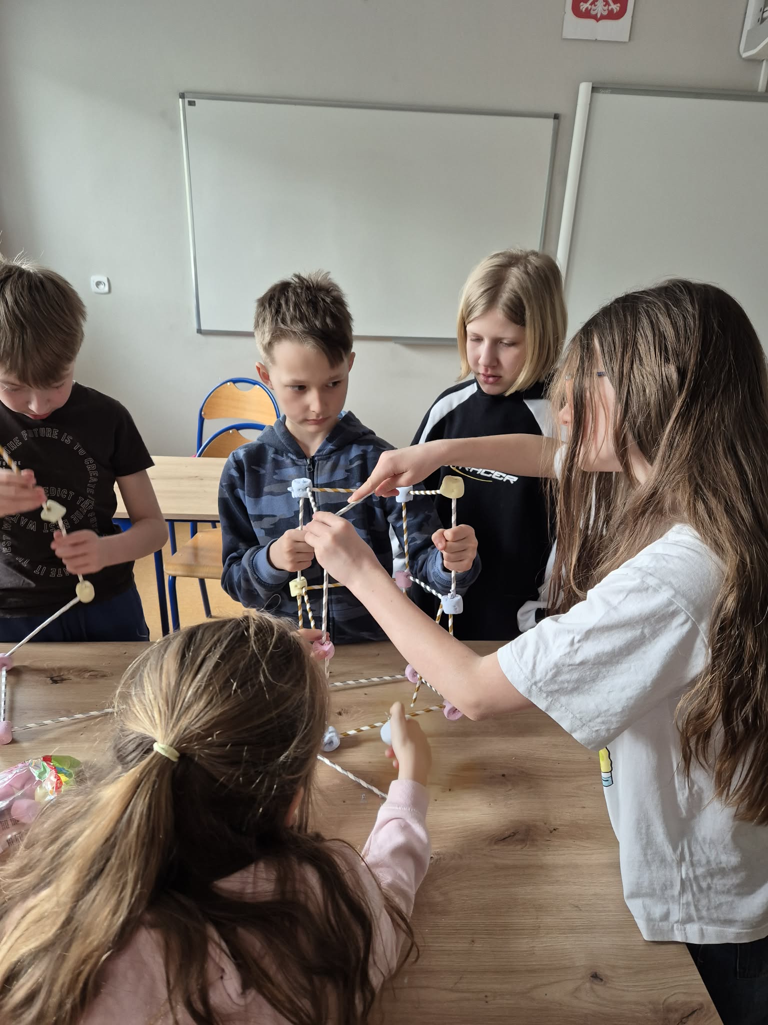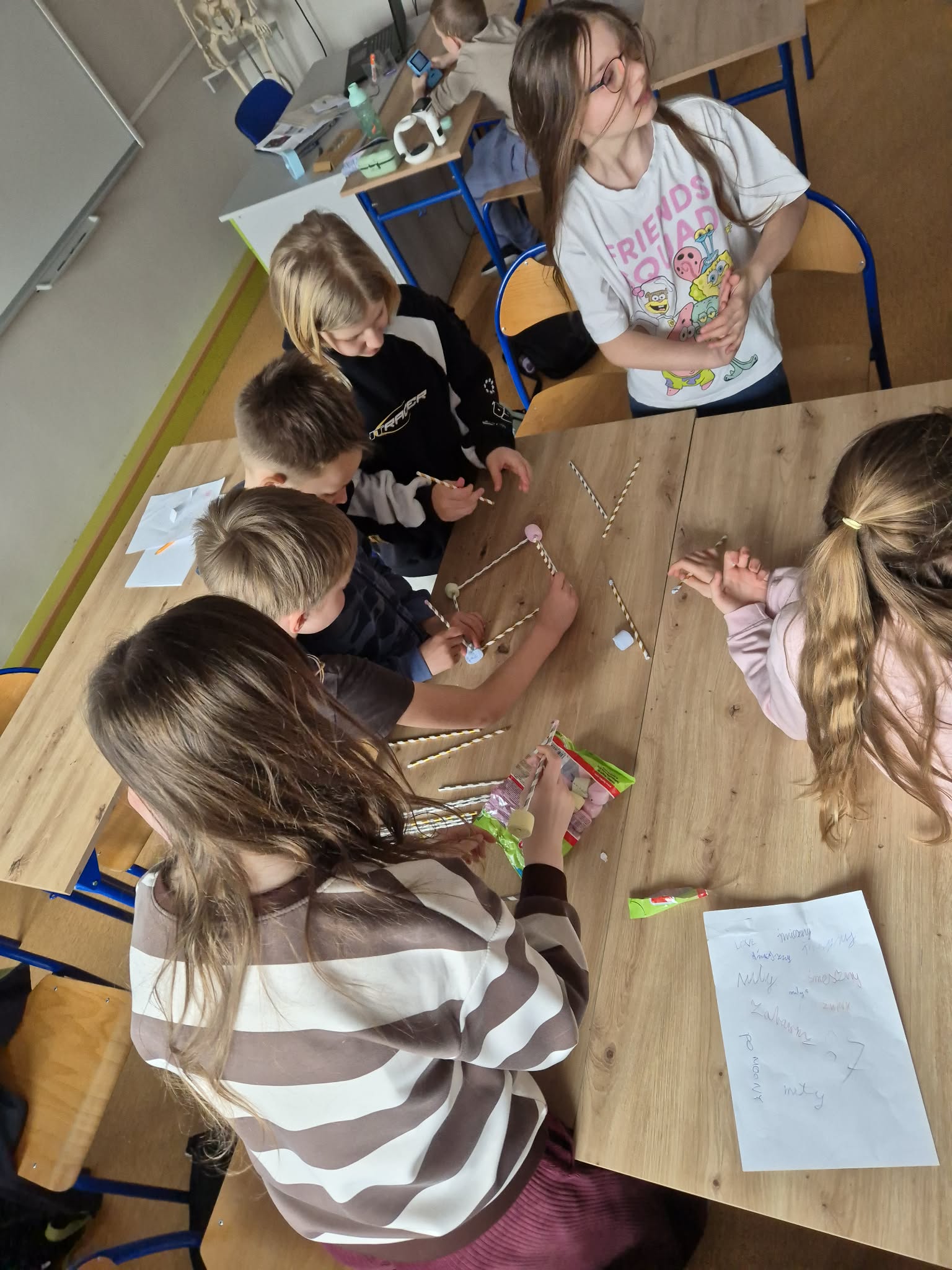Nie zabrakło także elementów współpracy i kreatywności – uczniowie w grupach budowali wieże z rurek i pianek. Zadanie wymagało pomysłowości, komunikacji oraz pracy zespołowej, a powstałe konstrukcje były naprawdę imponujące.
