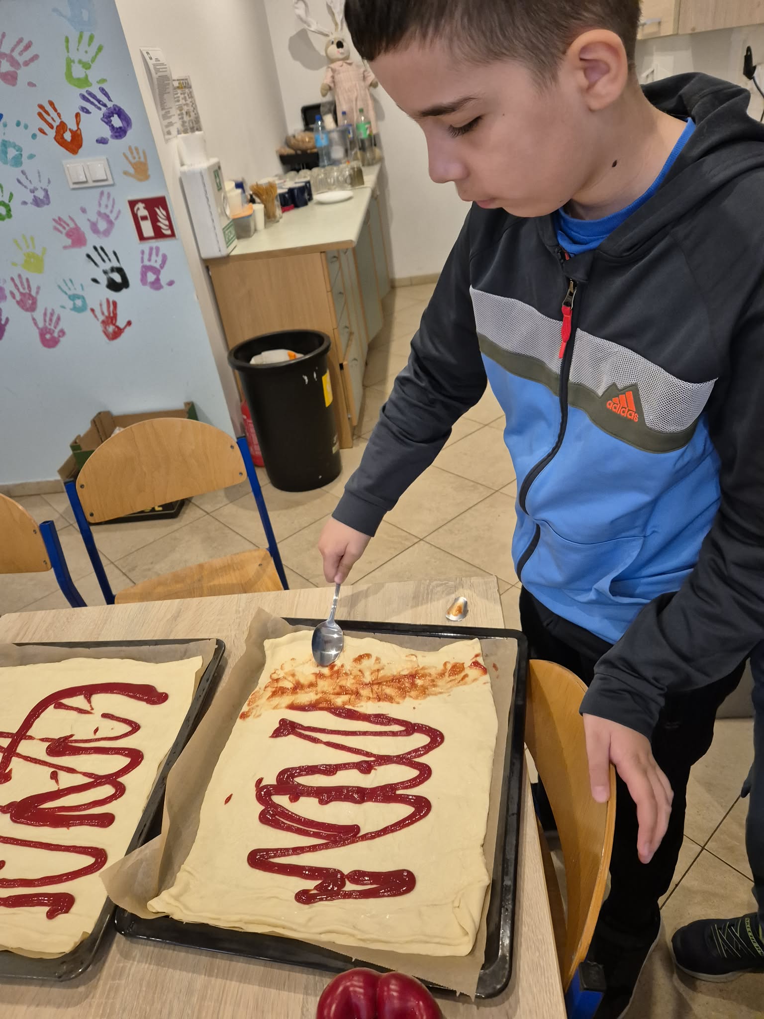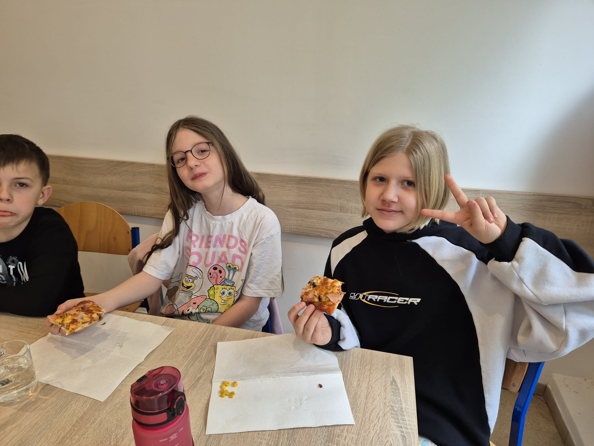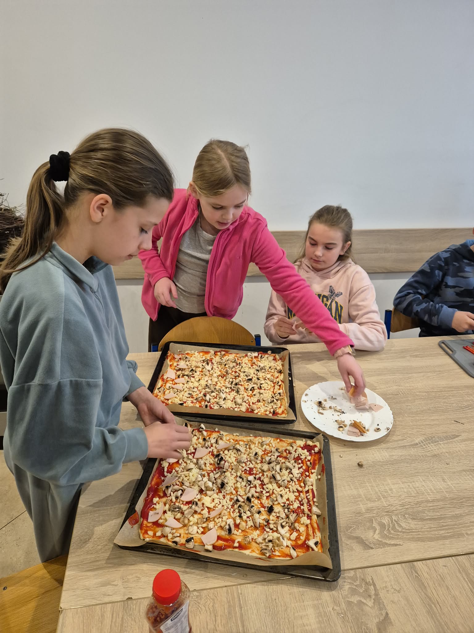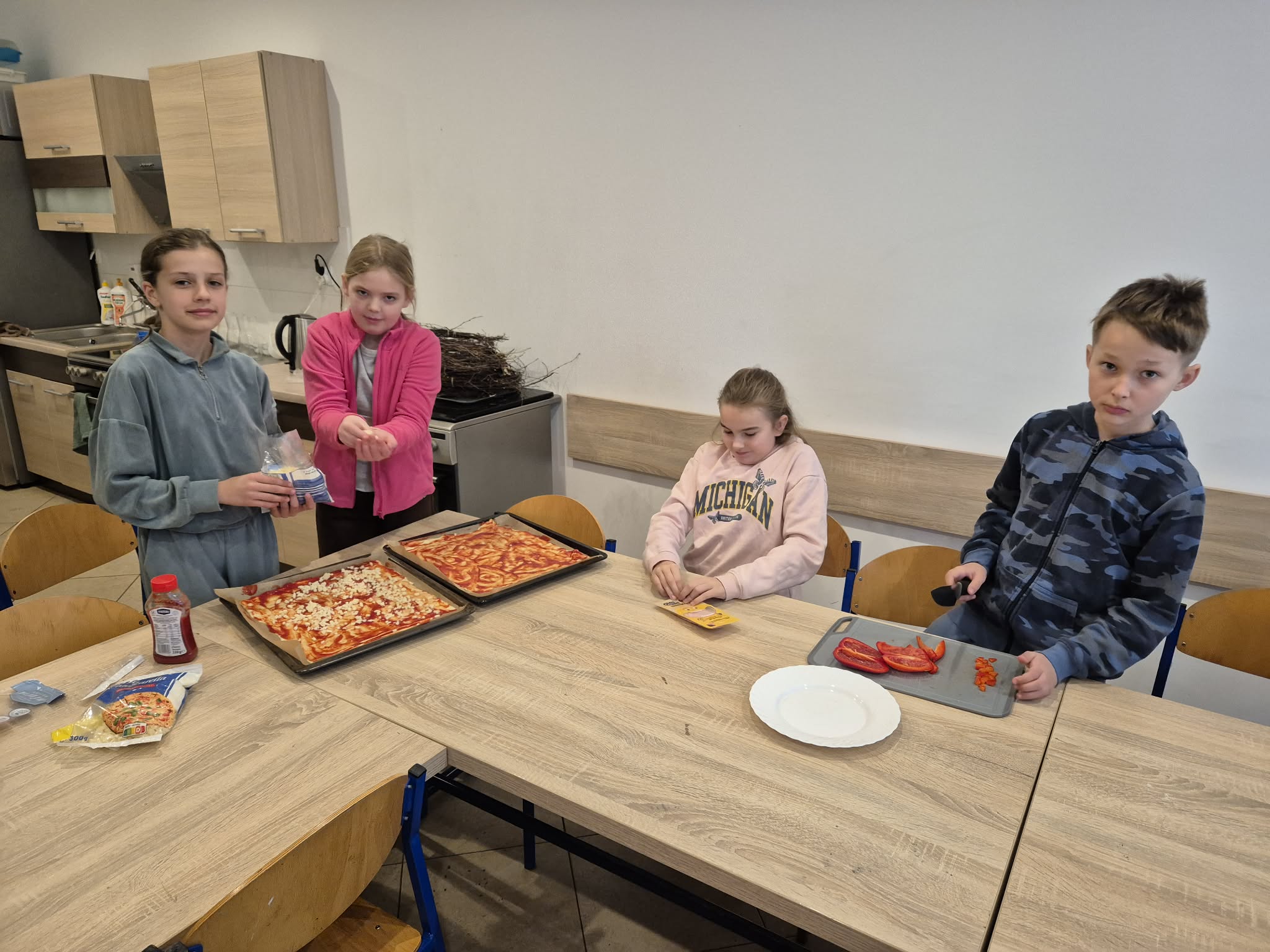 Pierwszy dzień wiosny w klasie 4 upłynął w bardzo radosnej i integrującej atmosferze. Uczniowie rozpoczęli dzień od wyjątkowej aktywności – pisali sobie nawzajem miłe słowa i krótkie wiadomości, co wywołało wiele uśmiechów i pozytywnych emocji. Była to doskonała okazja do wzmacniania relacji w klasie i budowania życzliwej atmosfery. Kolejną atrakcją było wspólne pieczenie pizzy. Dzieci z dużym zaangażowaniem przygotowywały składniki, komponowały własne kompozycje smakowe, a następnie z radością degustowały efekty swojej pracy.
