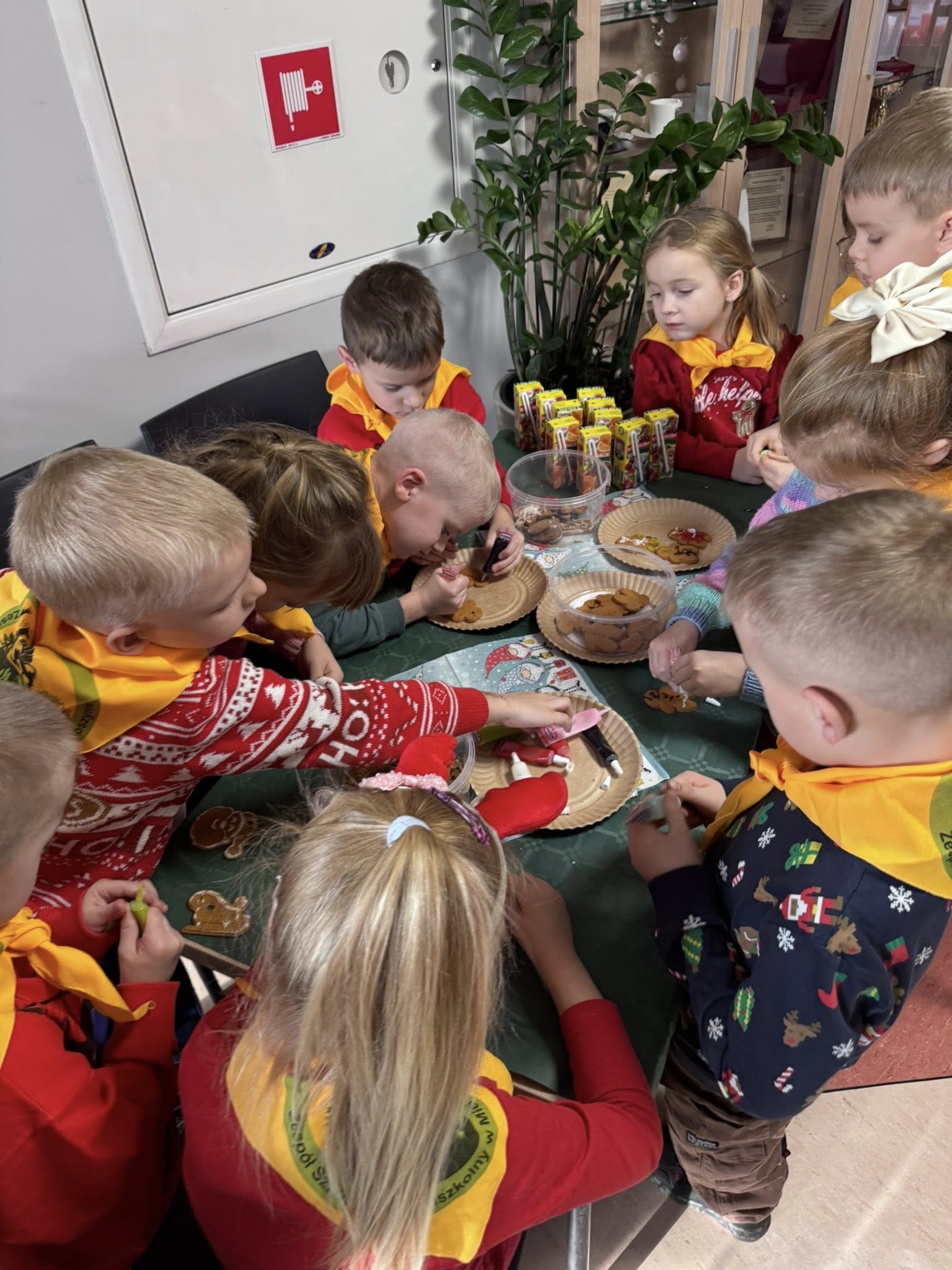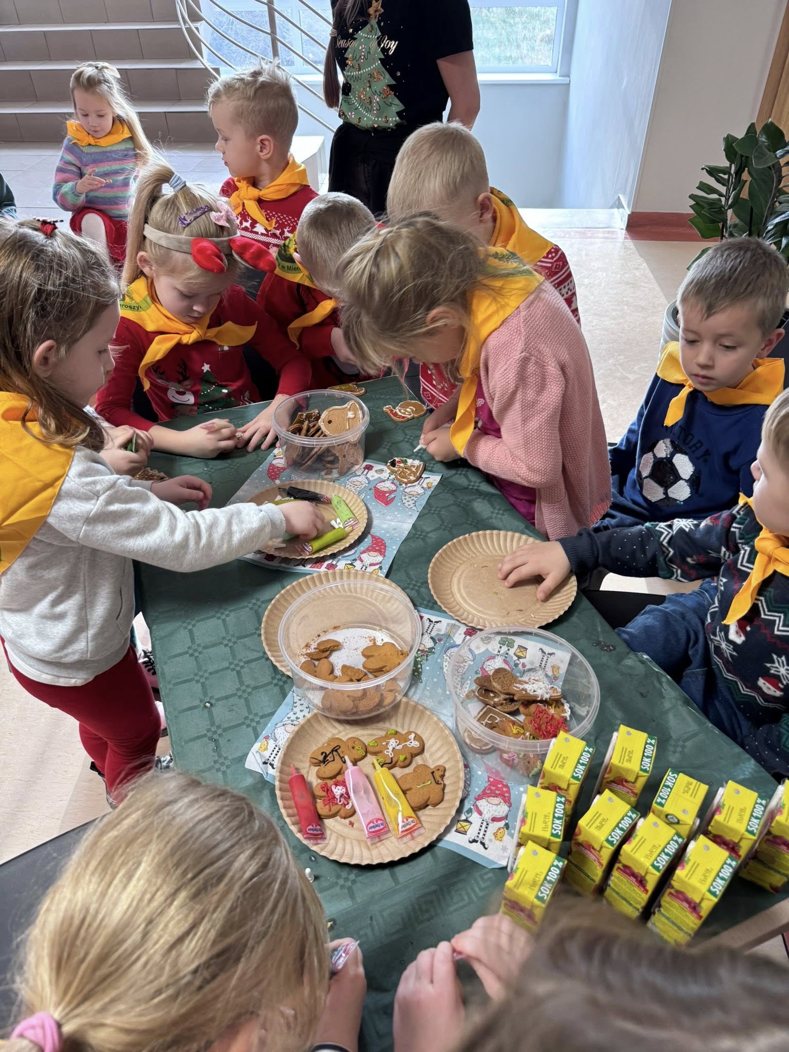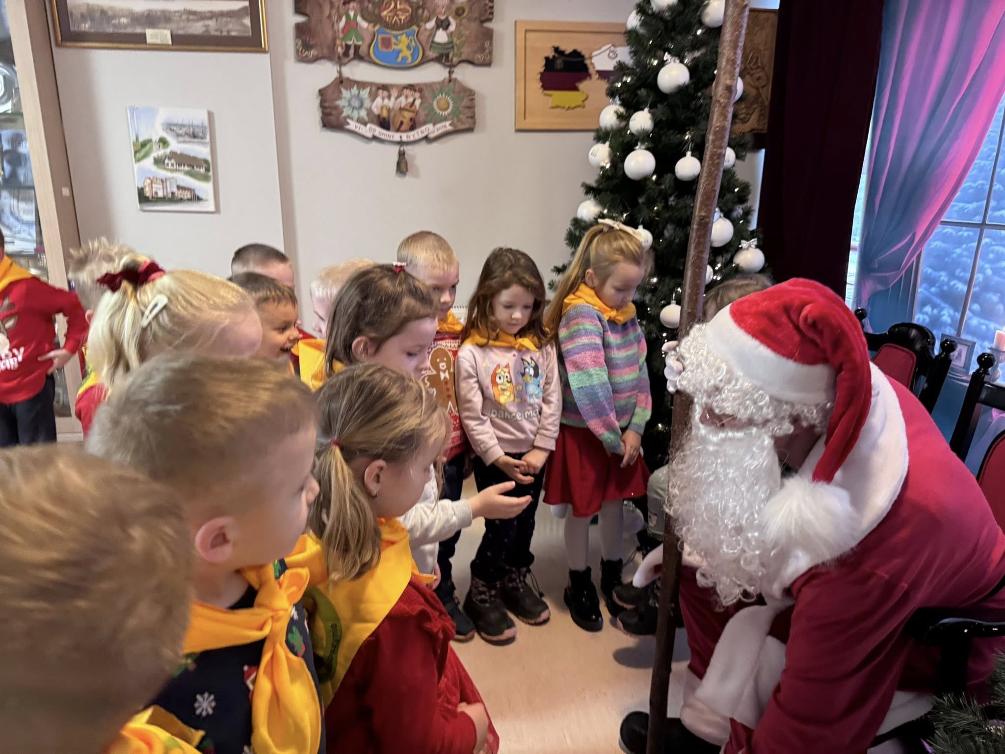 W dniu 5.12.2025 nasze przedszkolaki udały się do Urzędu Gminy w Pucku na spotkanie ze św. Mikołajem. Wizyta upłynęła w wyjątkowo radosnej i świątecznej atmosferze. Dzieci wzięły udział w warsztatach artystycznych, podczas których ozdabiały własnoręcznie pierniczki oraz wykonały świąteczne ozdoby. Wspólna praca twórcza dostarczyła im wiele radości i pozwoliła poczuć magię zbliżających się Świąt Bożego Narodzenia.