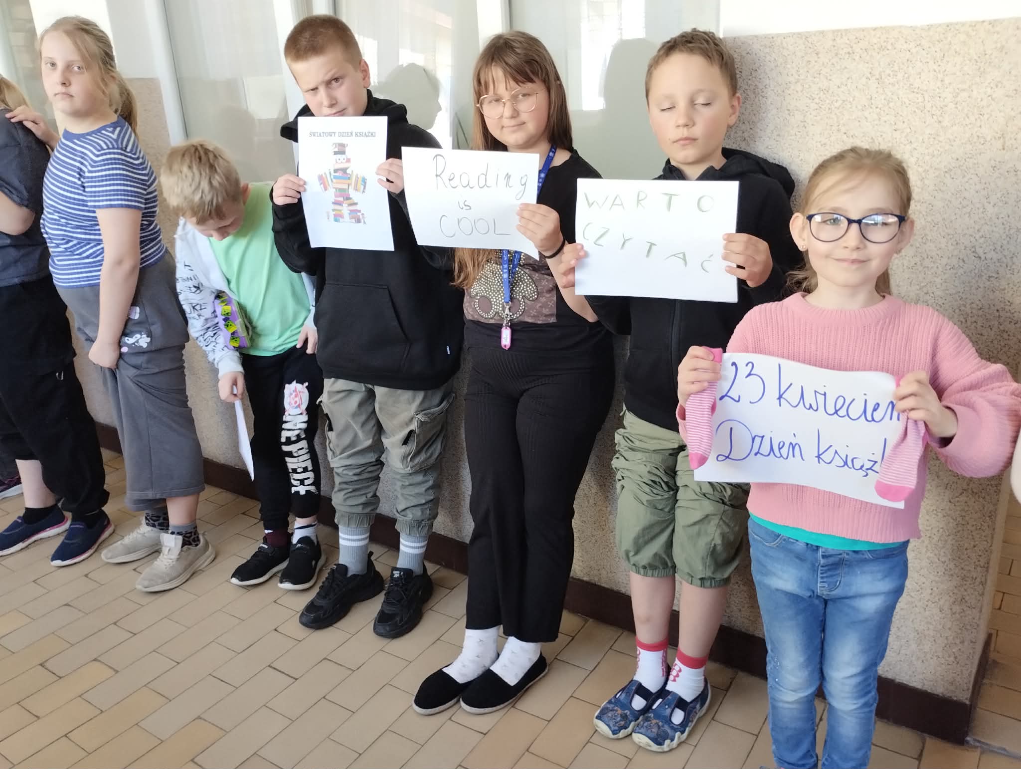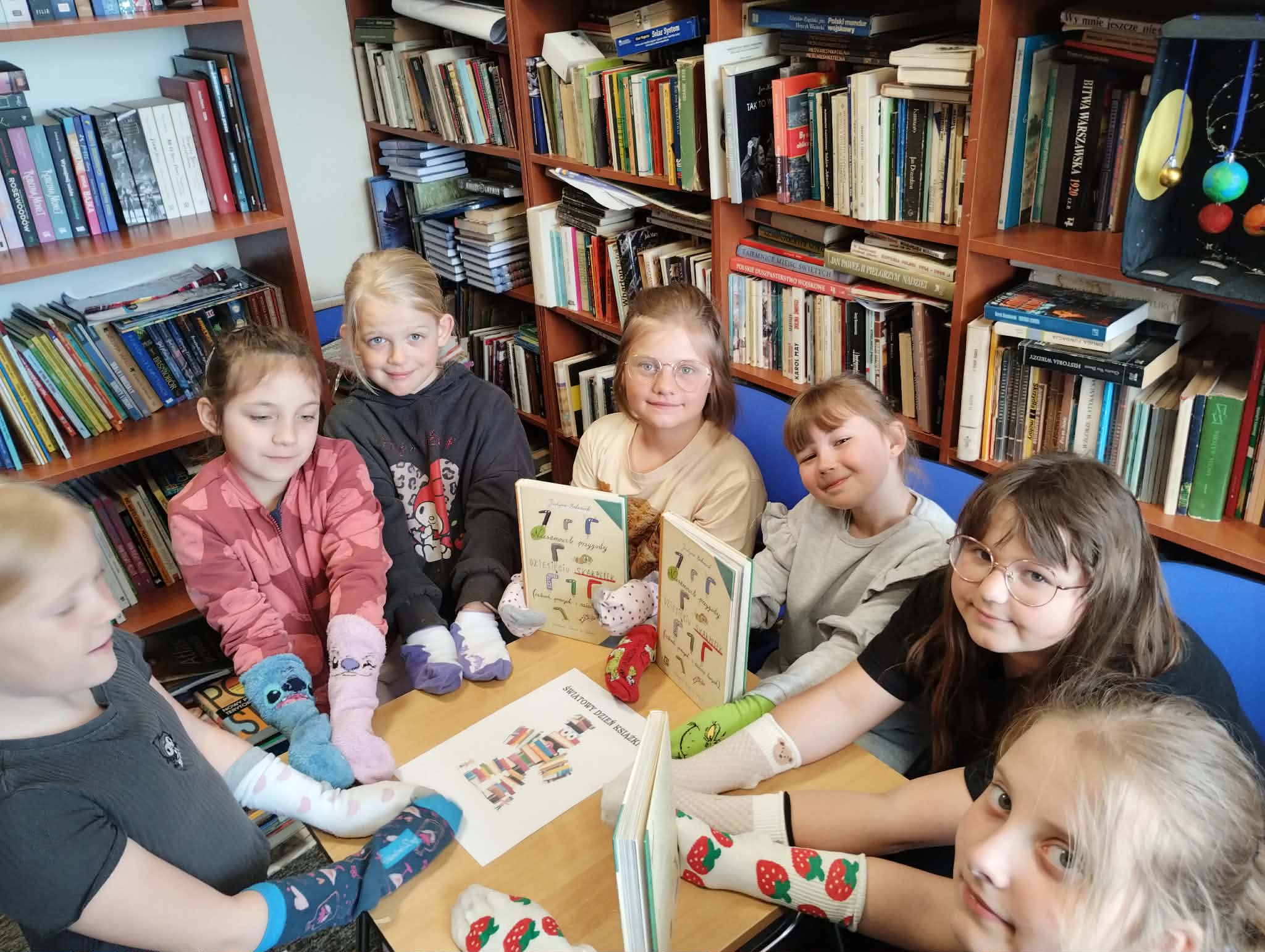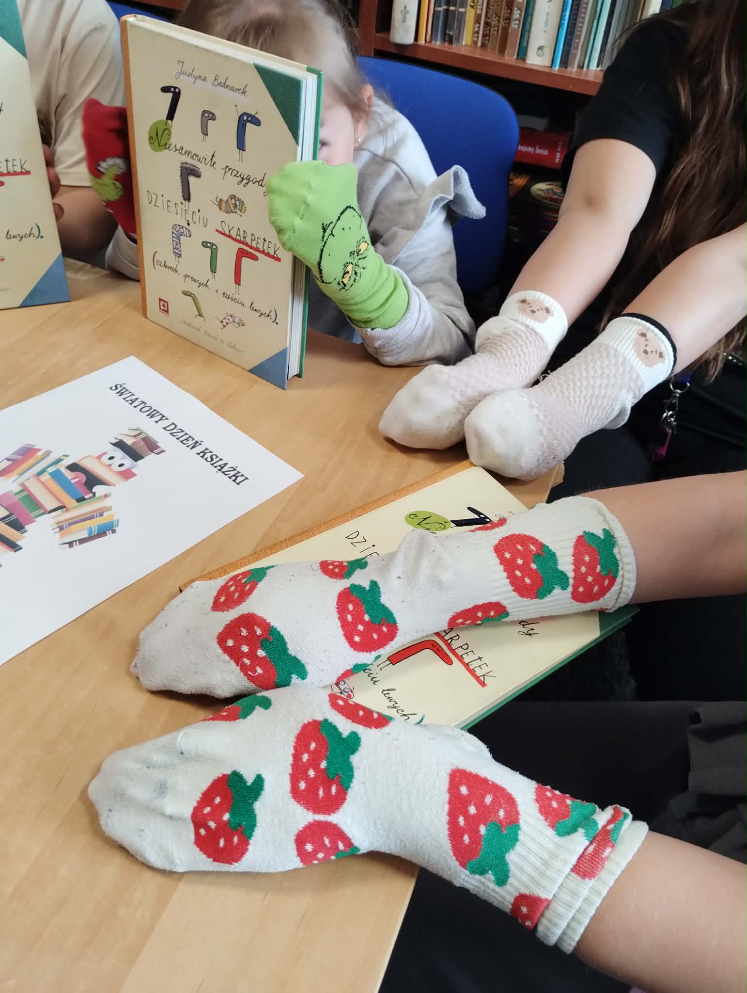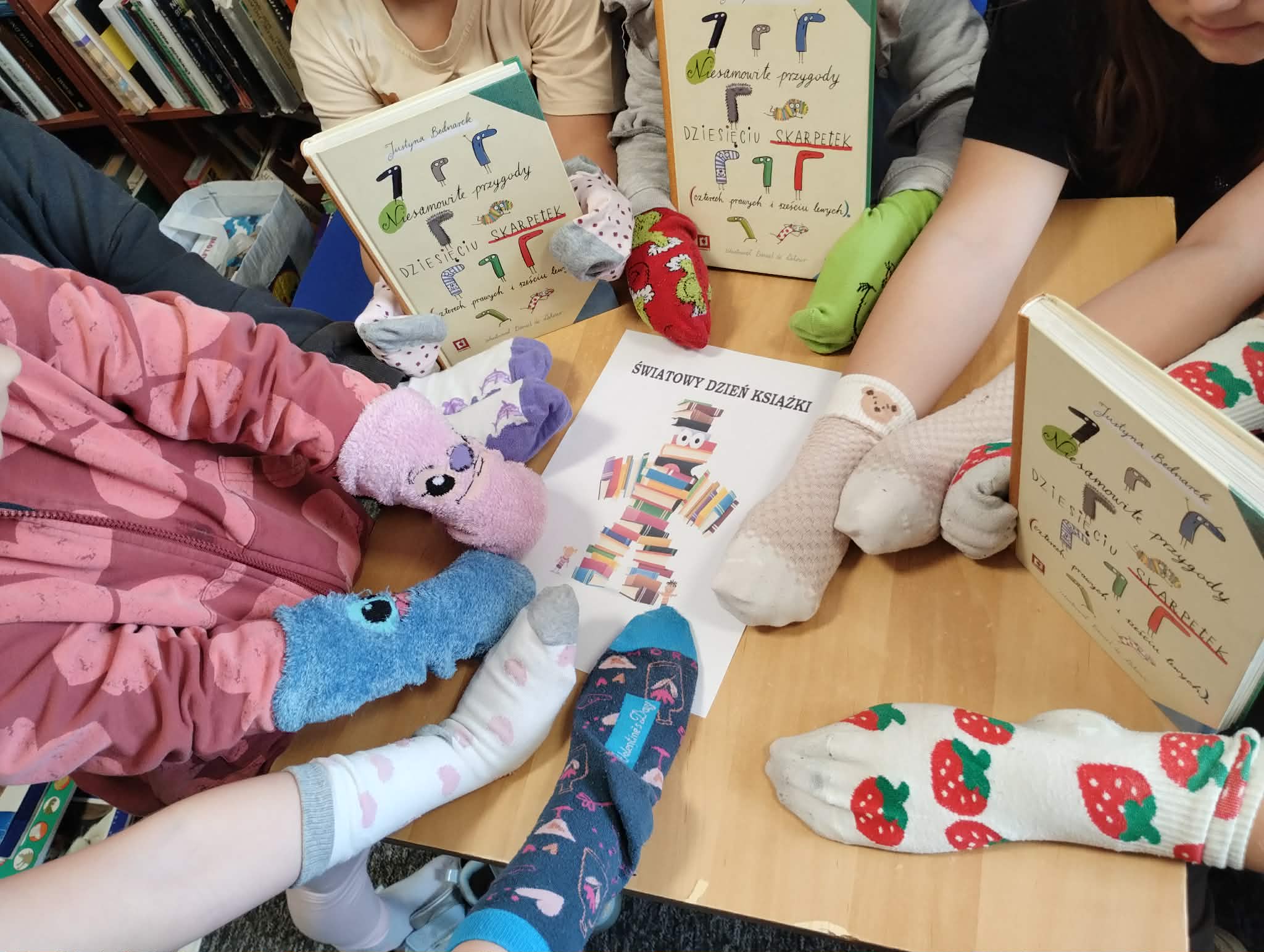 Z okazji Światowego Dnia Książki i Praw Autorskich w dniu 23 kwietnia został zorganizowany tzw. "przemarsz skarpetek" uczniów klas 1-3. Pani Justyna Bednarek napisała jedną z ostatnio bardziej znanych książek: "Niesamowite przygody 10 skarpetek...", dlatego chcieliśmy uczcić Dzień Książki i Praw Autorskich specjalnym przemarszem w najbardziej kolorowych skarpetkach oraz pochwalić się skarpetkami, które mogą przeżywać ciekawe przygody. Uczniowie klas 4-8 prezentowali natomiast bluzy z sentencjami, które są im bliskie lub, które ich rozweselają. Dziękuję wszystkim zainteresowanym za udział w akcji. Anna Kaleta