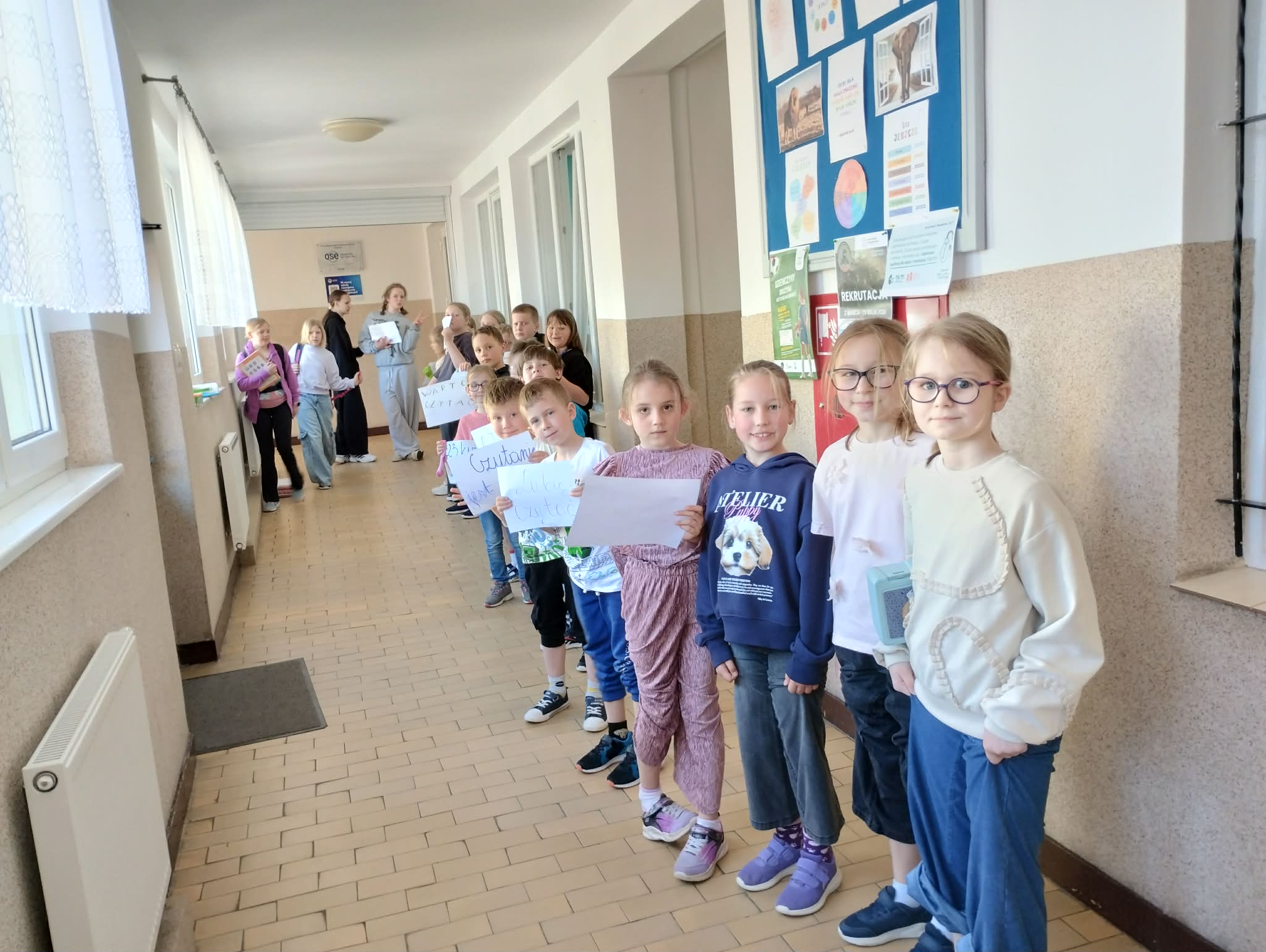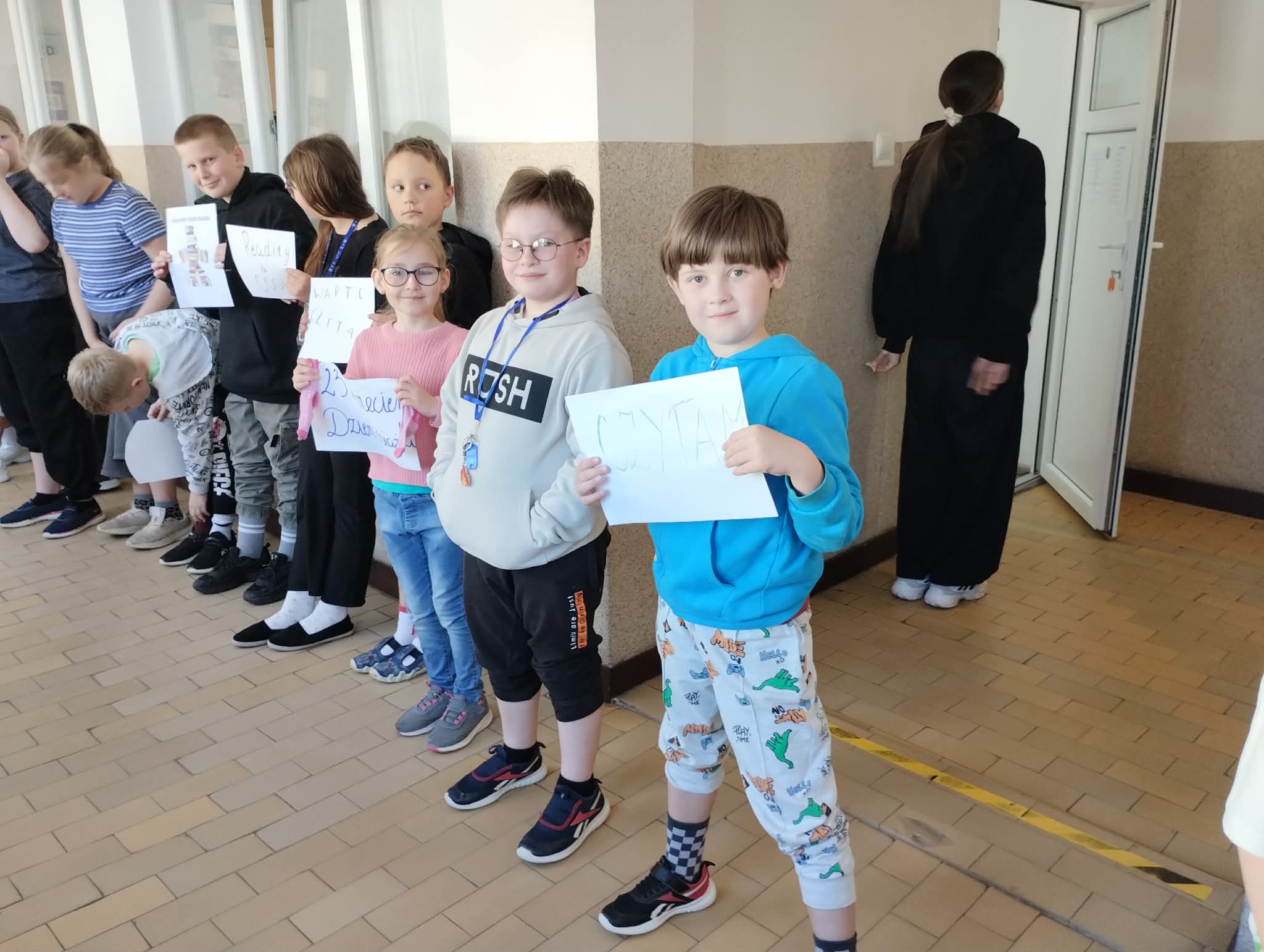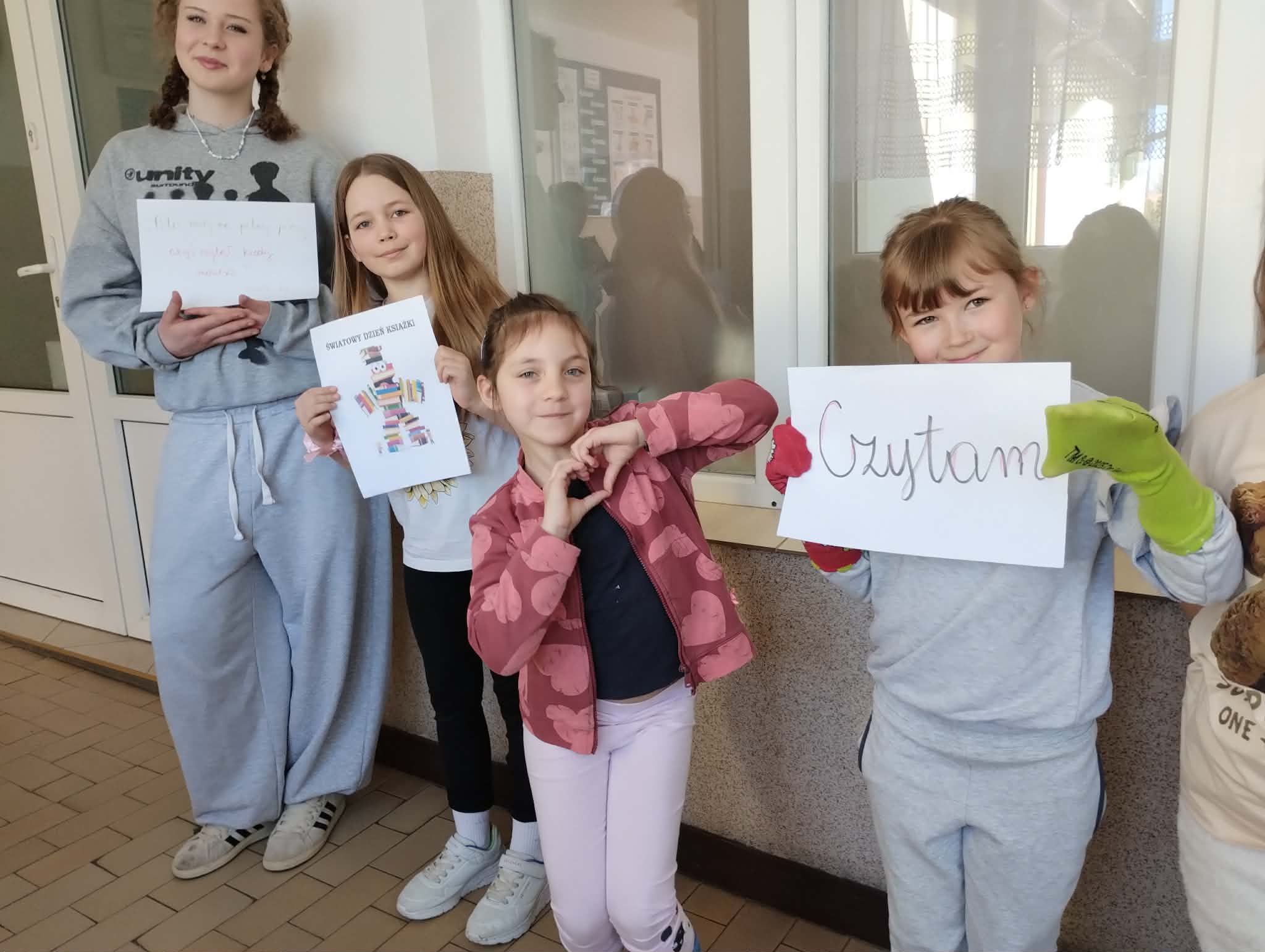 Z okazji Światowego Dnia Książki i Praw Autorskich w dniu 23 kwietnia został zorganizowany tzw. "przemarsz skarpetek" uczniów klas 1-3. Pani Justyna Bednarek napisała jedną z ostatnio bardziej znanych książek: "Niesamowite przygody 10 skarpetek...", dlatego chcieliśmy uczcić Dzień Książki i Praw Autorskich specjalnym przemarszem w najbardziej kolorowych skarpetkach oraz pochwalić się skarpetkami, które mogą przeżywać ciekawe przygody. Uczniowie klas 4-8 prezentowali natomiast bluzy z sentencjami, które są im bliskie lub, które ich rozweselają. Dziękuję wszystkim zainteresowanym za udział w akcji. Anna Kaleta